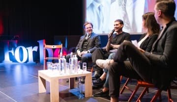 COO Fondee Laureen Höllge, umělecká ředitelka Opery Moravského divadla Veronika Loulová, režisérka Cam Van Ngoyenvá a designérka Eliška Monsportová odpovídají na dotazy Petra Šimůnka. Foto: Forbes
