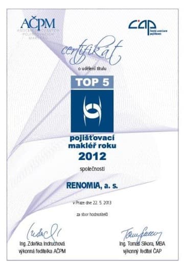 RENOMIA, a. s., získala titul TOP 5 Pojišťovací makléř roku 2012 a potvrdila svou vedoucí pozici na trhu. Anketu organizovala Asociace českých pojišťovacích makléřů společně s Českou asociací pojišťoven. Pojišťovací makléře hodnotili odborníci z řad pojišťoven dle kvality práce.